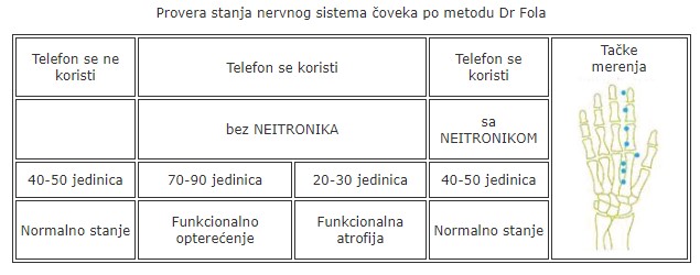 Koristeći metod dijagnostike po Dr Folu vršeno je ispitivanje efikasnosti zaštite od elektromagnetnog zračenja sredstva NEITRONIK. U donjoj tabeli dat je pregled dobijenih razultata za ispitivanje uticaja zračenja mobilnog telefona na nervni sistem ispitanika sa i bez NEITRONIKA.